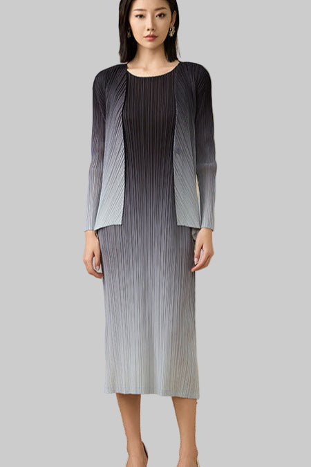 Bring a touch of modern elegance into your wardrobe with this pleated gradient two-piece set. Featuring a lightweight short cardigan jacket and a matching sundress, it blends sophistication with comfort for a look that works across seasons and occasions. The gradient color design adds depth and style, making the outfit stand out while staying refined.