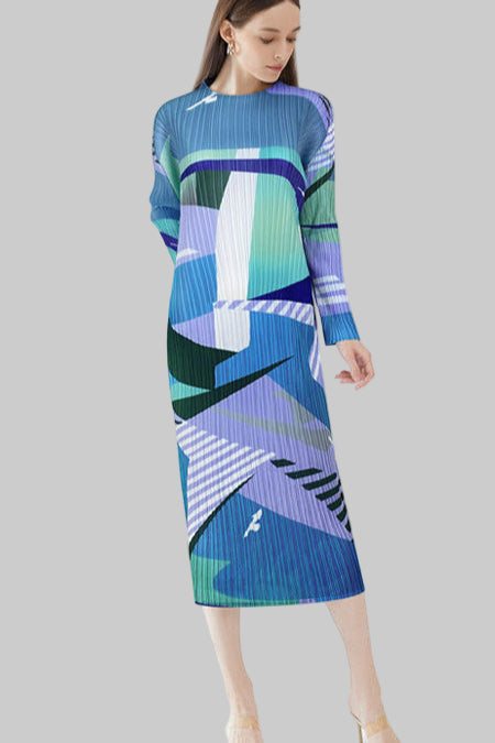 Bring effortless elegance to your wardrobe with this pleated printed midi dress. Designed with a slim A-line cut and long sleeves, it flatters the figure while offering all-day comfort. The soft pleats add graceful movement, while the artistic print makes it stand out with modern charm. Perfect for work, dinners, or special gatherings—pair it with heels for a polished look or with flats for chic everyday wear.