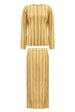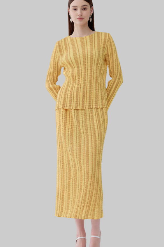 Elevate your wardrobe with this pleated two-piece set, featuring a striped top paired with a slim-fit skirt. The soft pleats create graceful movement, while the slim skirt flatters the figure for a chic silhouette. Perfect for work, dinners, or special occasions, this outfit balances comfort with elegance. Style it with heels for a polished evening look or with flats for an effortlessly stylish daytime outfit.