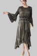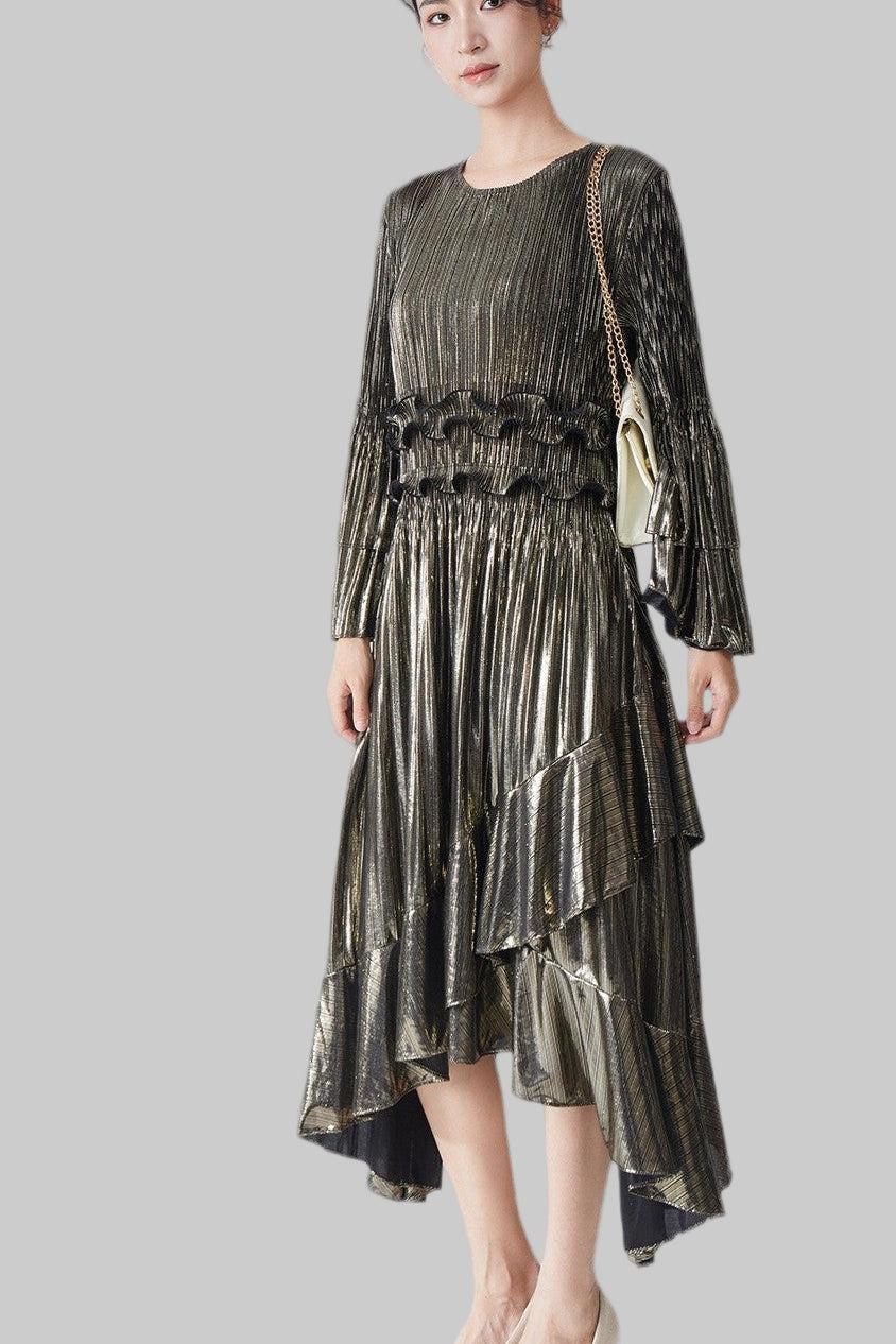 ✨ A pleated A-line dress—flared sleeves, irregular hem, and elegant for autumn and winter.