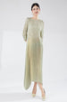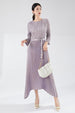Crafted from lightweight, wrinkle-resistant pleated fabric, this dress drapes beautifully without clinging, flattering the figure while staying breathable and easy to care for. The irregular cut adds a bold design element, while the bronzing detail gives it a high-end shimmer perfect for day-to-night transitions.
