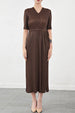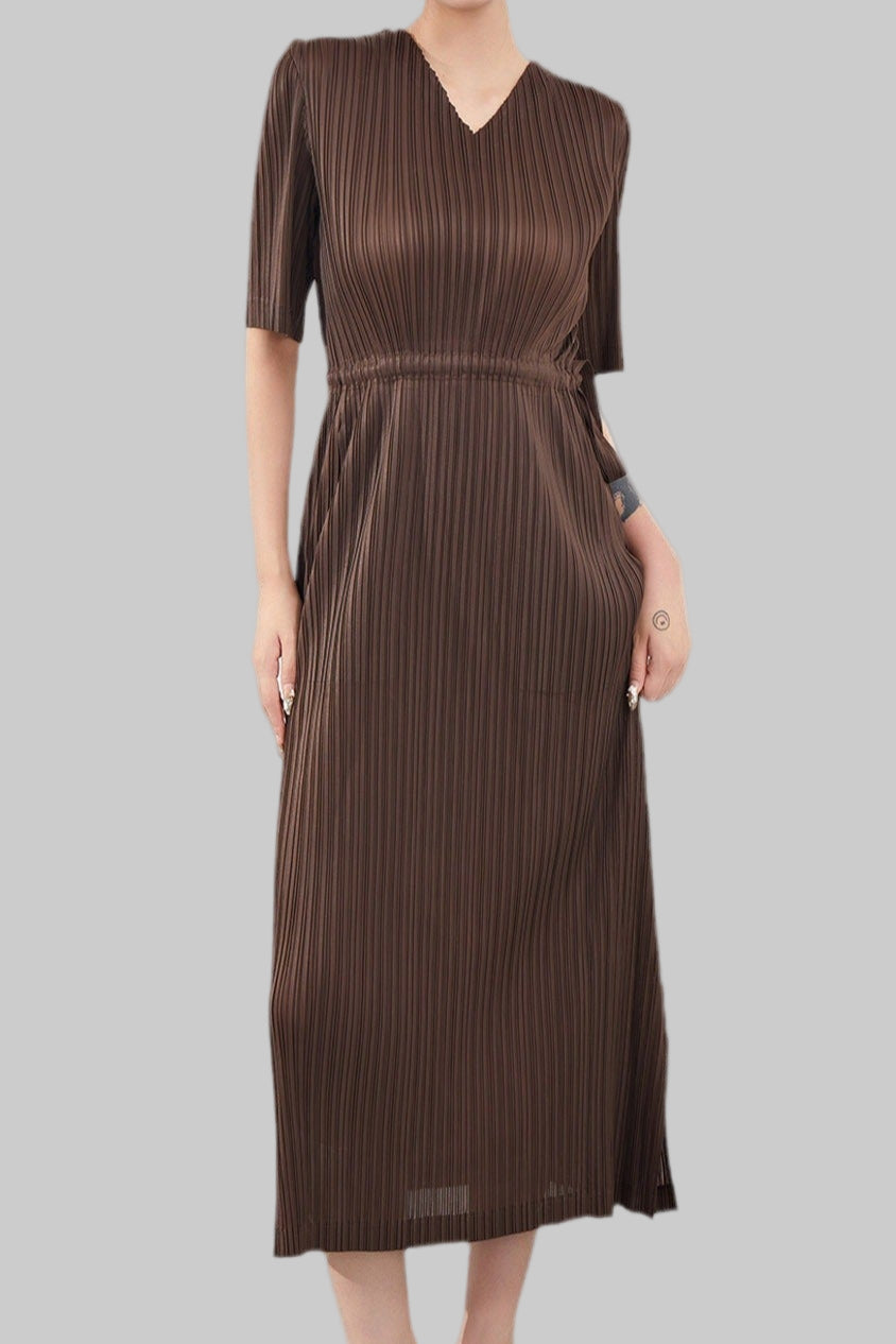 ✨ A pleated V-neck maxi dress—loose, slimming, and elegant for many occasions.