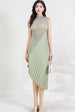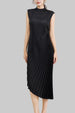 This is a beautiful dress with soft, wavy folds. The top has a small high neck that makes it look fancy but still very comfortable. The pleats (the little folds in the fabric) move when you walk, making the dress fun and special.