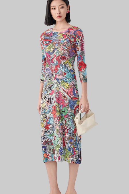 Make a bold statement this summer with this graffiti-print pleated maxi dress. Designed in a loose yet slimming silhouette, it flatters all body types while offering comfort and breathability for warm-weather days. The artistic graffiti pattern adds a modern, fashion-forward edge, while the flowing pleats create texture and movement for an elevated look.